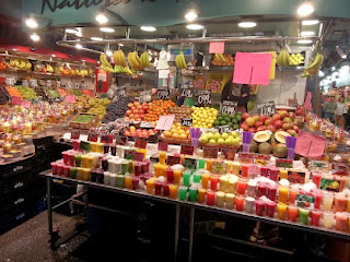 Mercat de la Boqueria is referred to as a "gastronomic temple - where locals come together in a community to eat, shop and gossip" ... there are over 60 permanent stalls and the market is open 5 days each week throughout the year ... what a luxury to have access to fresh food supplies like that ...
